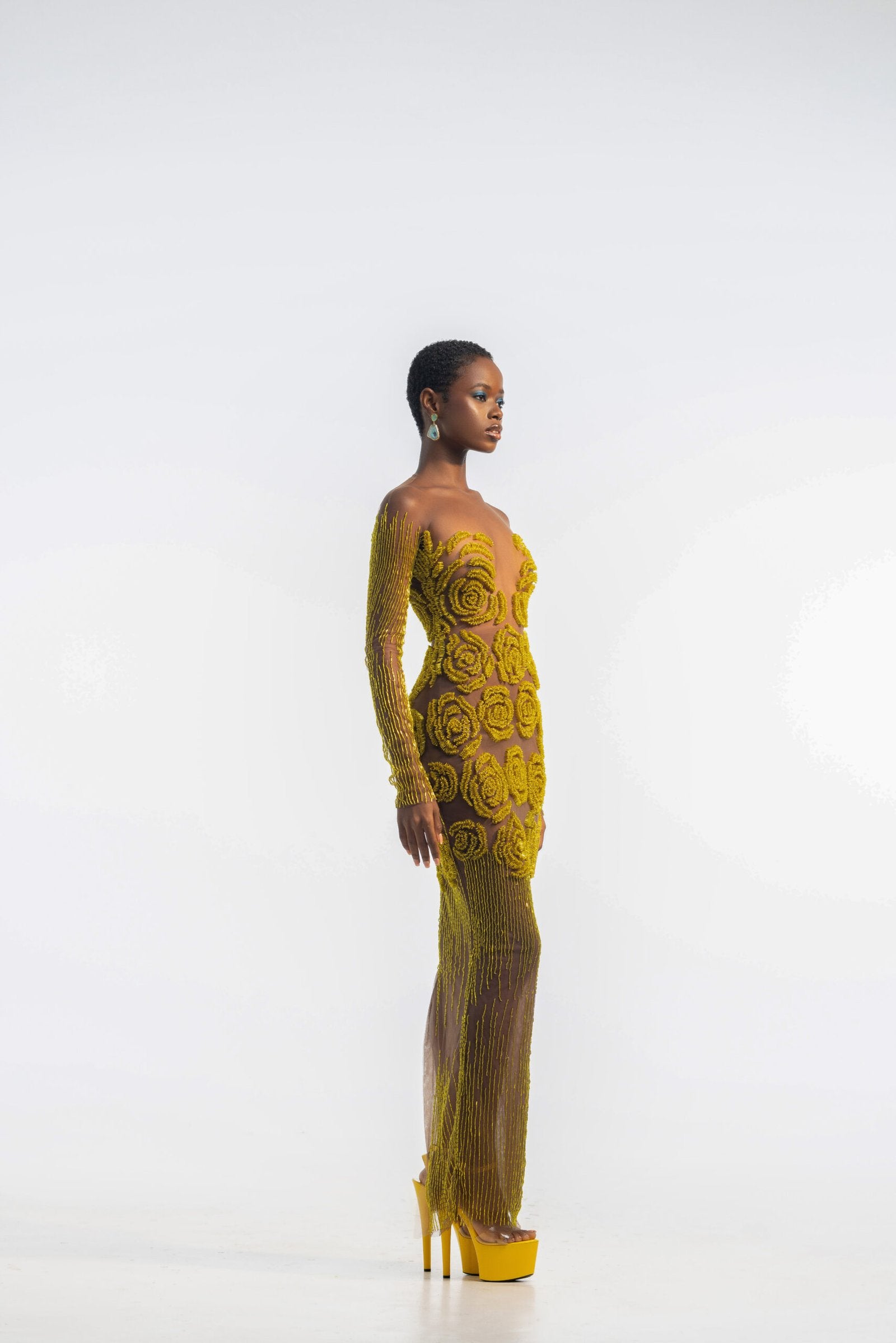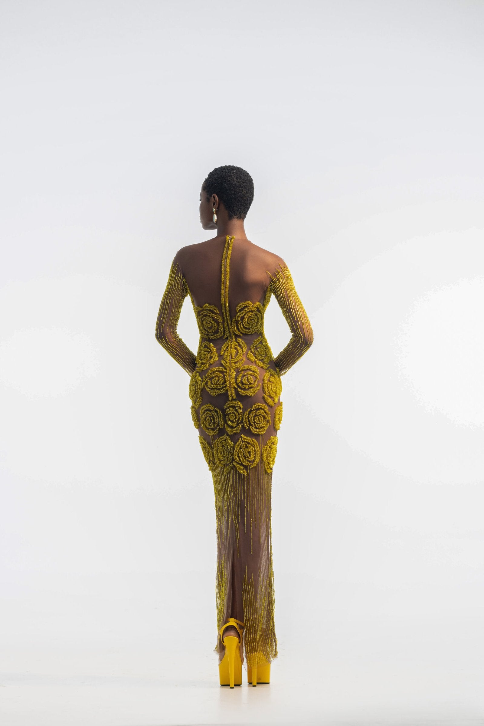 A remarkable work of art crafted using white/yellow bugle beads and skin-tone mesh. The vertical lines and intricate flower-inspired beading embroidery collaborate to form a pattern that immediately captures one's gaze. Additionally, the illusion neckline graciously blends with the skin, creating a seductive second-skin effect that amplifies its allure. Features: illusion neckline, sheer, long sleeves, ankle length, concealed zipper, an optional skin tone corset bodysuit and nude tulle lining Material: skin tulle