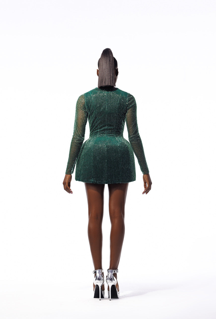 The glinting beads add a touch of sparkle, enhancing the dress in the right places and under the right lighting, while the structured lower half creates an exaggerated posterior with a stylish slit.