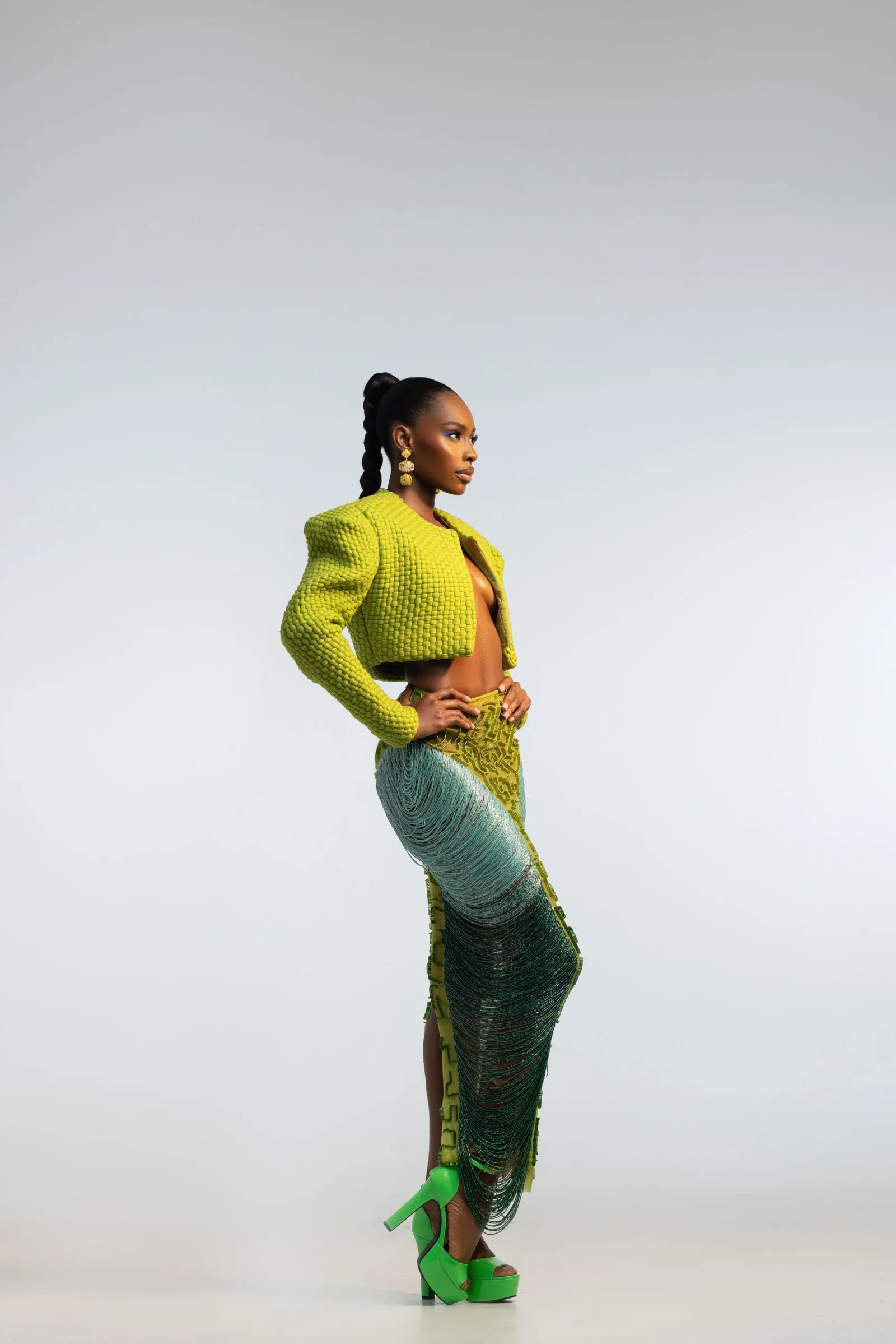 For an extra enchanting effect, blue and green beads are meticulously layered at the sides, enhancing the shape of the wearer.