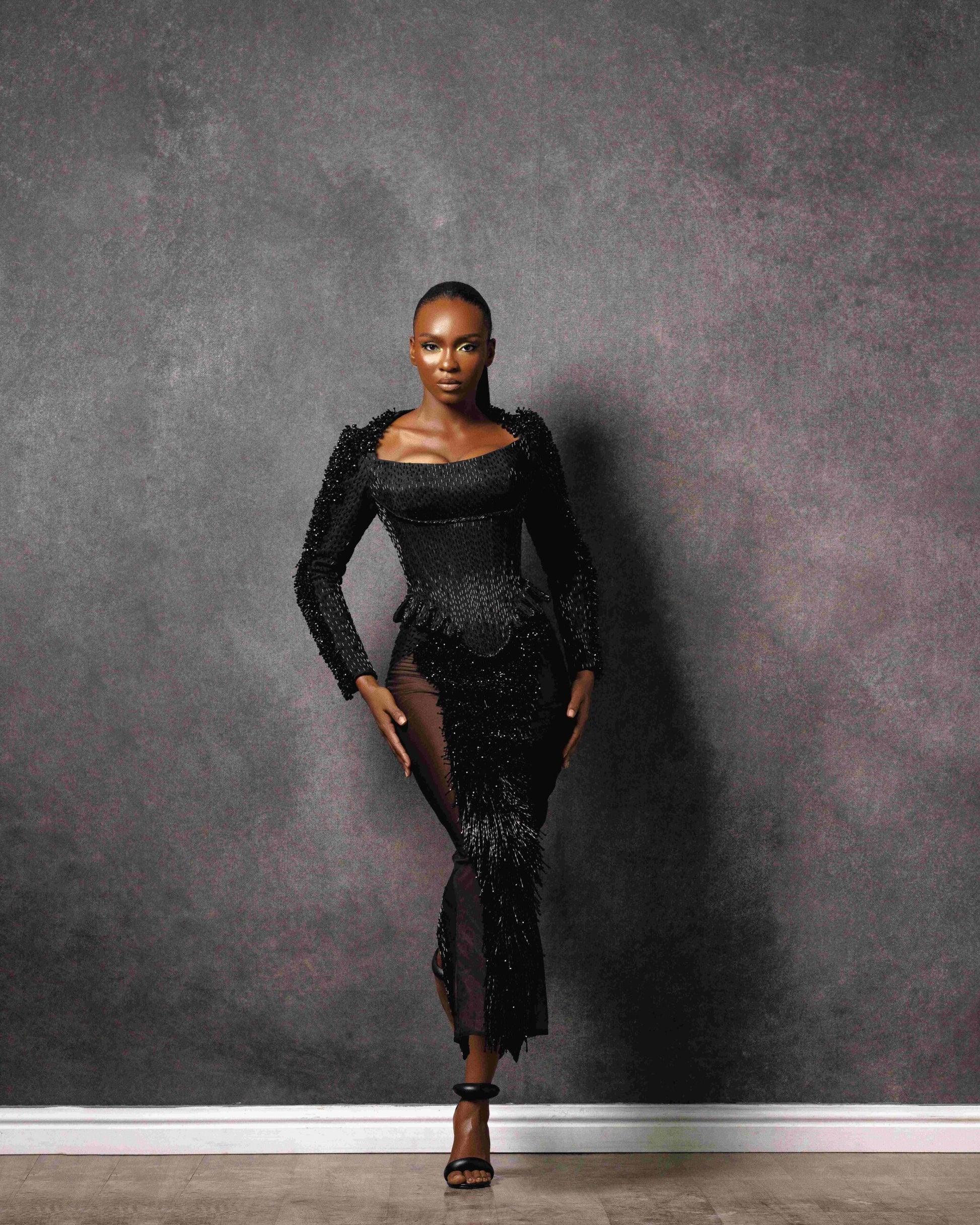 The fully beaded corset top and partially beaded fitted midi skirt exude power and confidence.