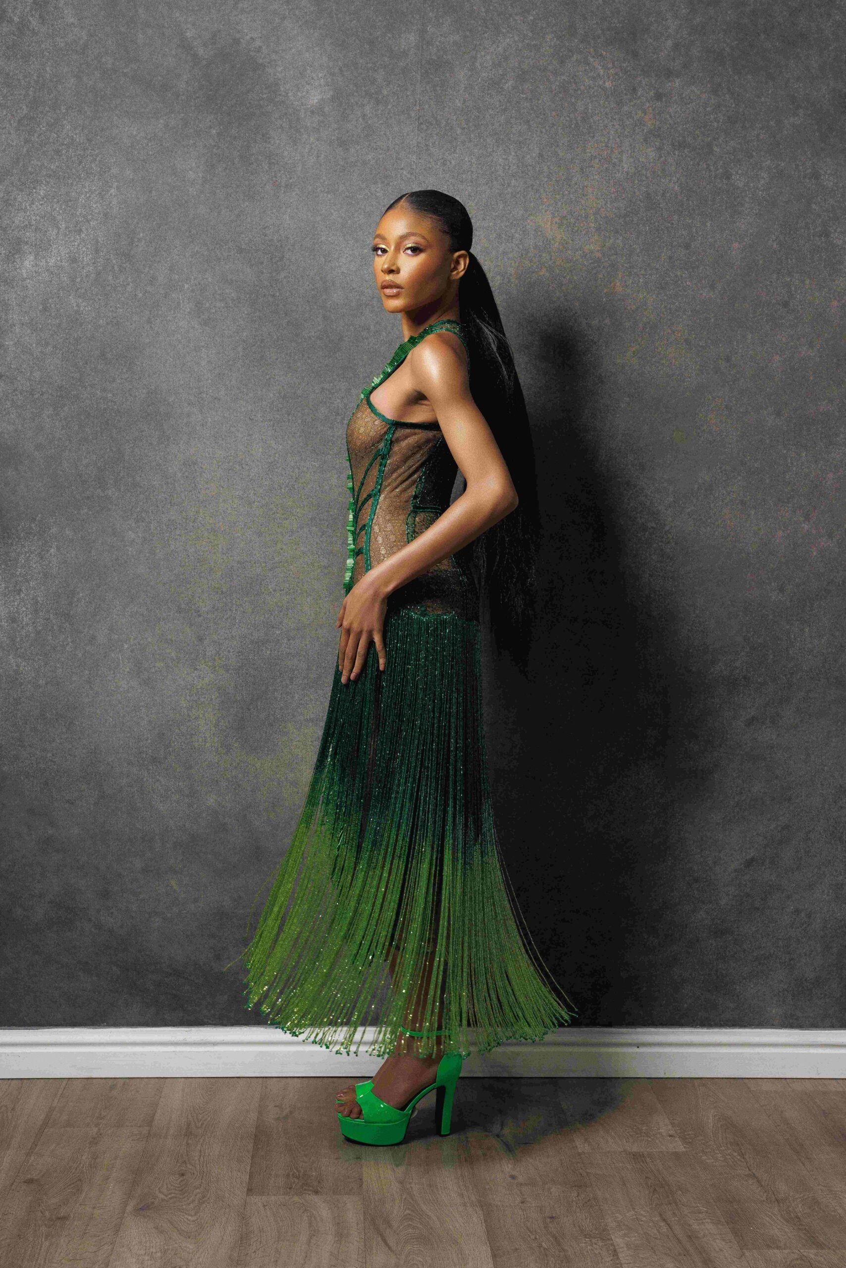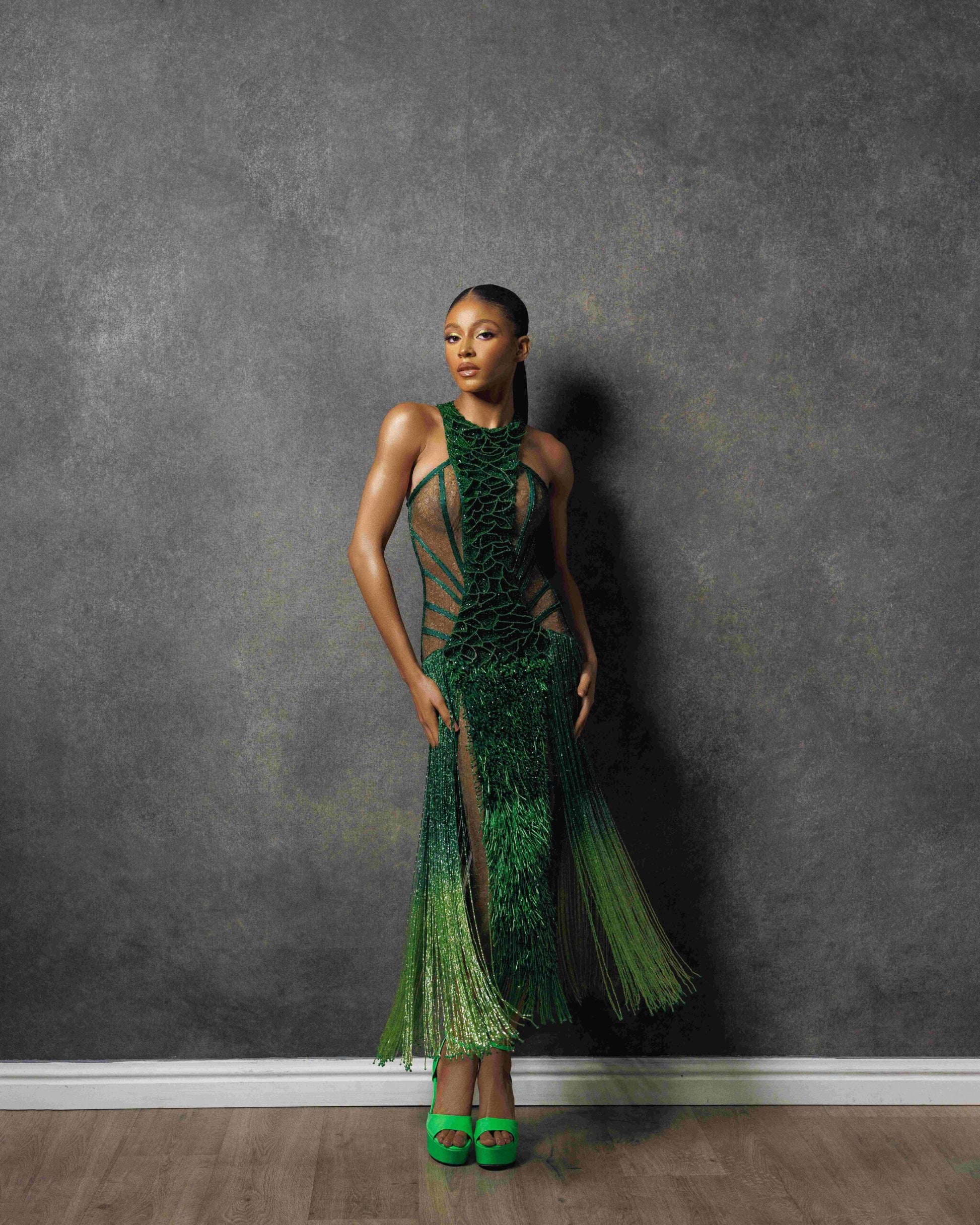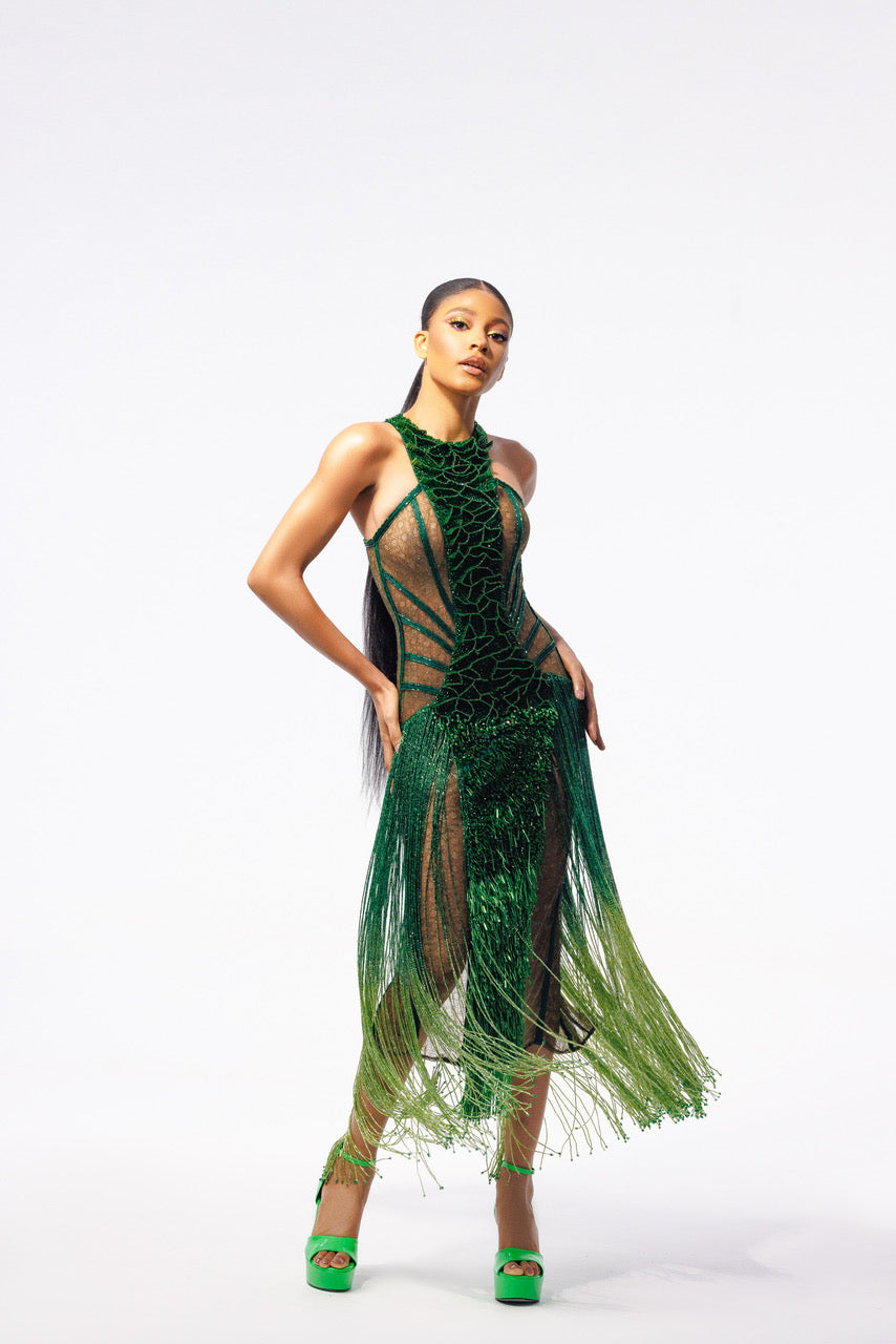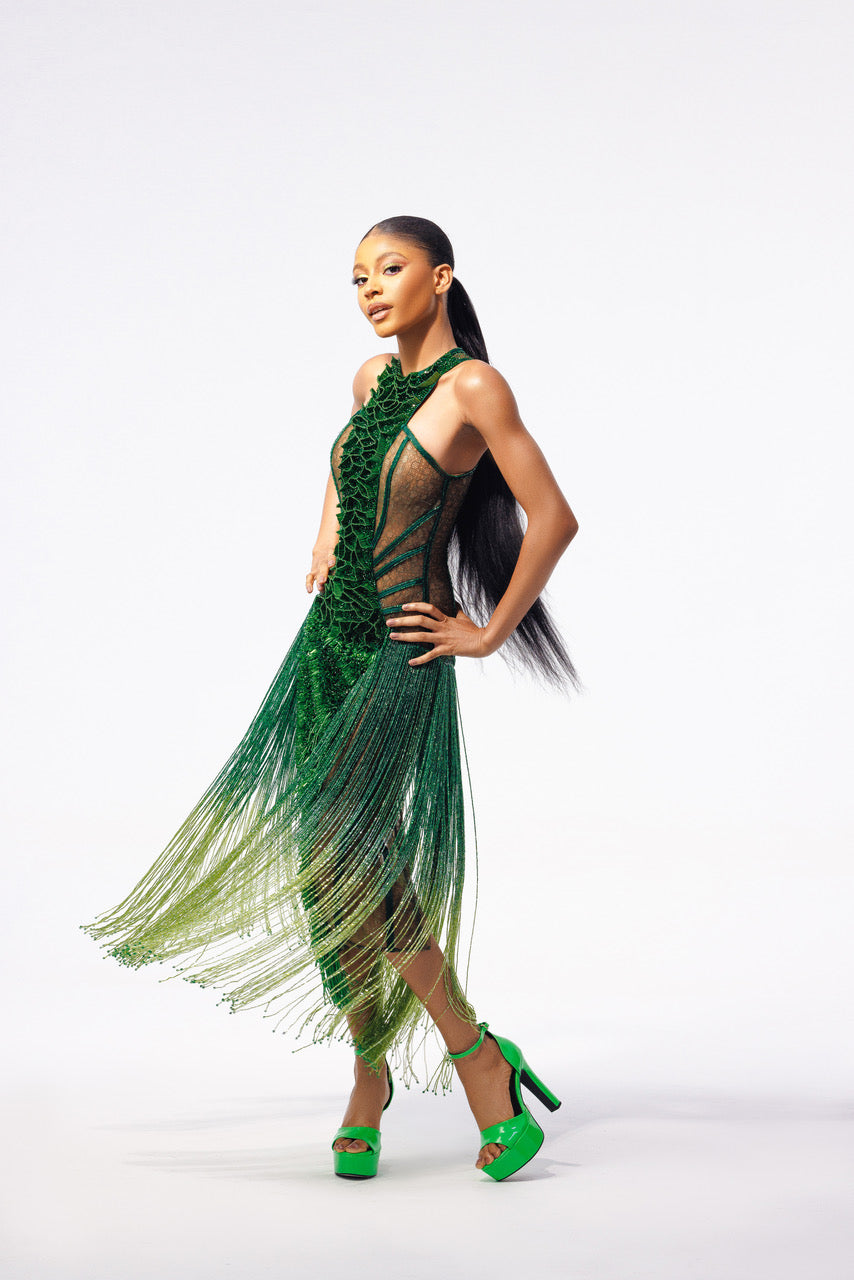 The grass-like beading details from the waistline to the bottom of the dress further accentuate the playful element. And let’s not forget the fringe details, a joyful reminder to embrace happiness and have fun!